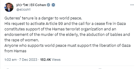ברשת החברתית X (לשעבר טוויטר), הוא כתב הבוקר (חמישי, 7 בדצמבר): "המזכ"ל גוטרש הוא איום על שלום העולם". בקשתו להפעיל את סעיף 99 [מאמנת האומות המאוחדות] ובקשה להפסקת אש בעזה היא לתמוך בארגון הטרור חמאס ו….