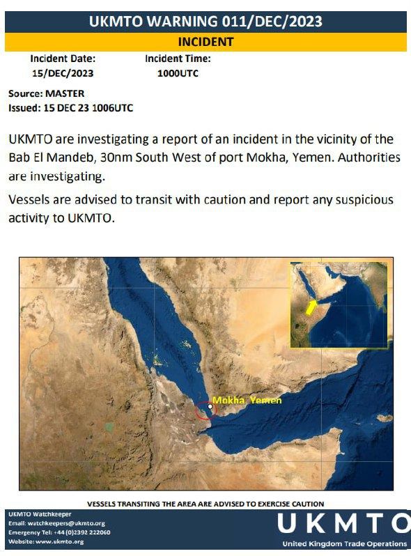 קודם לכן, שני כלי שיט במים ליד תימן דיווחו על אירוע ביטחוני, שאחד מהם כלל התקפת טילים והשני התקרב לסירת מנוע עם חמושים כדי לשנות את מסלולה. (פרטים נוספים)