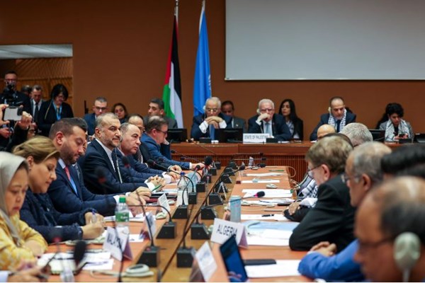 דיפלומט איראני רם דרג זה אמר לעיתונאים כי פגישה זו חלה בקנה אחד עם יום השנה ה-75 לאימוץ ההצהרה האוניברסלית בדבר זכויות האדם בז'נבה ואמר: "מצער כי ב-75 שנה לאימוץ ההכרזה האוניברסלית בדבר זכויות האדם, ובעוד אירוע זה מונצח בז'נבה, המרכז האירופי של האו"ם, אנו עדים לרצח עם בפלסטין, וחמור מכך, אמריקה, שהיא המארחת והמארחת. המטה של האומות המאוחדות, העביר בימים האחרונים החלטה שעצרה. הוא הטיל וטו בעצמו על המלחמה והרג נשים וילדים.