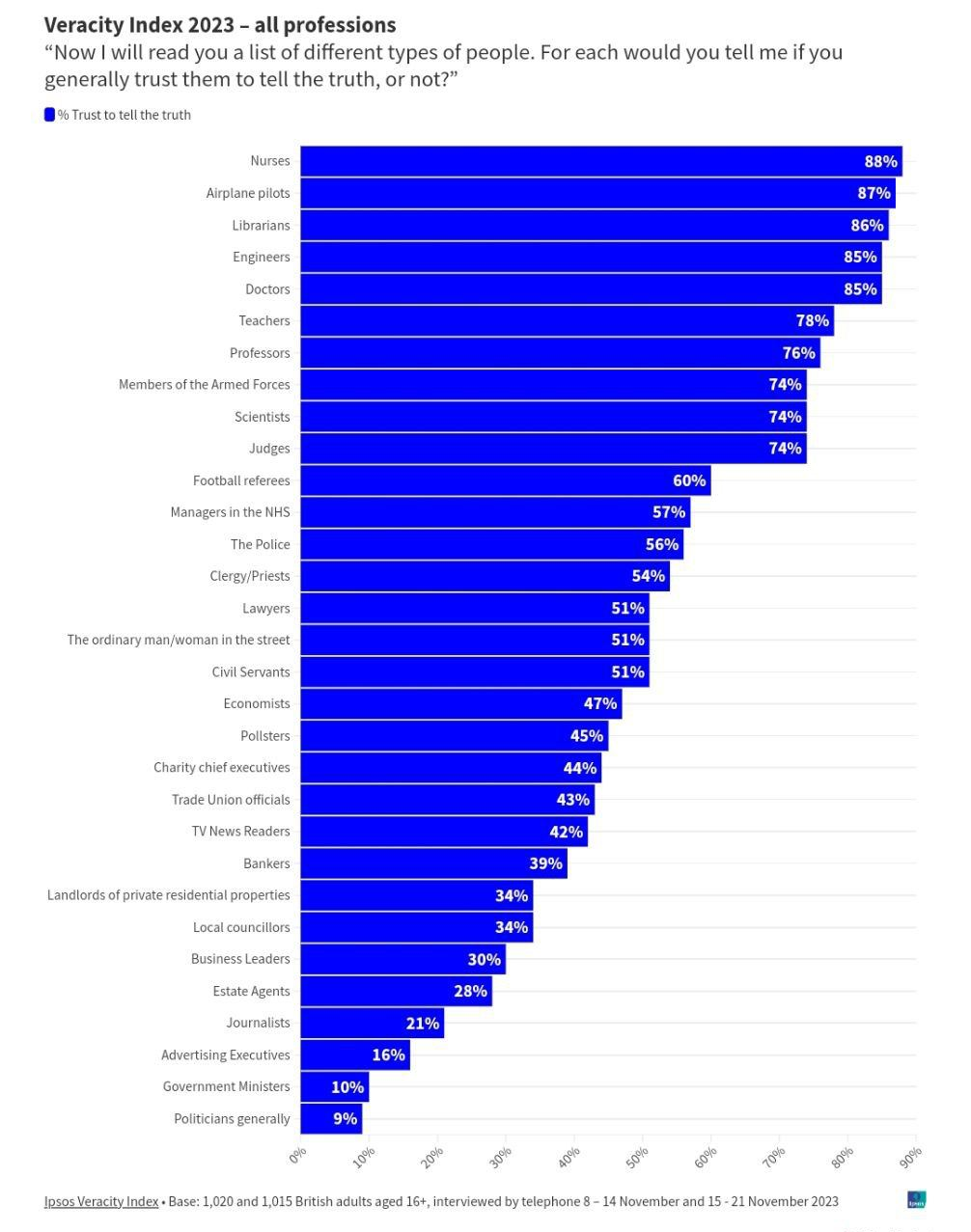 איפסוס העריכה את האמון הכללי של הבריטים בעבודות, לפיה רמת האמון באחיות באנגליה הייתה 88%, וטייסי מטוסים וספרנים בהתאמה, עם 87 ו-86 אחוז, הם משכו את הכמות הגבוהה ביותר של אמון הציבור. לבריטים היה הכי פחות אמון בהם.