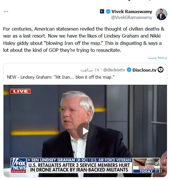 Vivek Ramaswamy, המועמד הרפובליקני לבחירות לנשיאות ארה"ב, כינה את הערותיה האחרונות של לינדזי גרהם על "הסרת איראן מהמפה" כמגעילות וביקר אותה בחריפות.