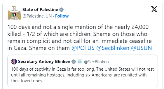 היום, בהודעה ב-X, כינתה הנציגות הפלסטינית באו"ם את חוסר תשומת הלב של שר החוץ האמריקני ל-24,000 הפלסטינים שנרצחו במאה ימים של התקפות ישראל מבישה.