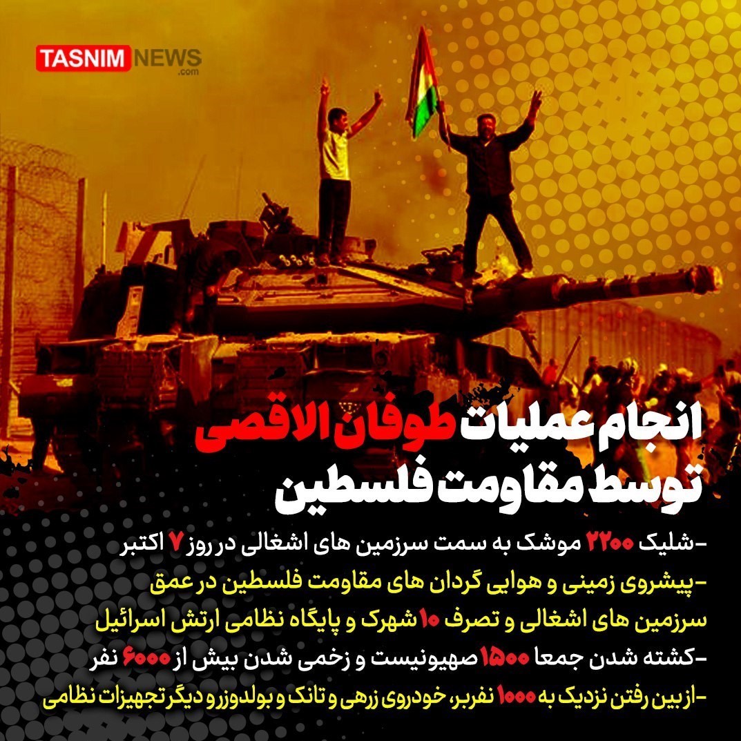 מבצע סערת אל-אקצא של ההתנגדות הפלסטינית ב-7 באוקטובר בעומק השטחים הכבושים לווה בירי של 2,200 רקטות לעבר אזורים שונים, כיבוש של 10 התנחלויות וצבא. בסיסים, והרג של יותר מ-1,500 מתנחלים וחיילים ציונים.