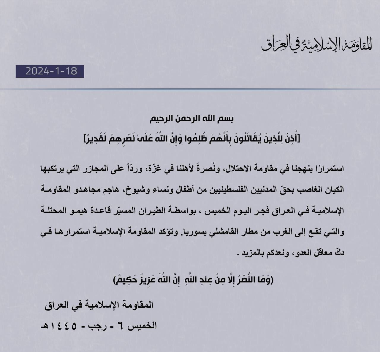 ההכרזה על ההתנגדות האסלאמית העיראקית שוב בהצהרה כי כתמיכה בתושבי עזה ומתעמת עם הכיבוש האמריקני באזור, הבסיסים האמריקנים בשדה הנפט "אל-עומר" ותקפו את הכפר "אלח'דרה" בסוריה עם שני מל"טים.