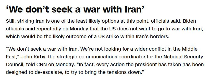 מתאם התקשורת האסטרטגית של המועצה לביטחון לאומי של הבית הלבן, ג'ון קירבי, אמר אתמול (שני) ל-CNN: "אנחנו לא מחפשים מלחמה עם איראן". אנחנו לא מחפשים סכסוך גדול יותר במזרח התיכון. למעשה, כל פעולותיו של הנשיא (ביידן) נועדו במטרה להפחית את הסלמה ולנסות להפחית מתחים".