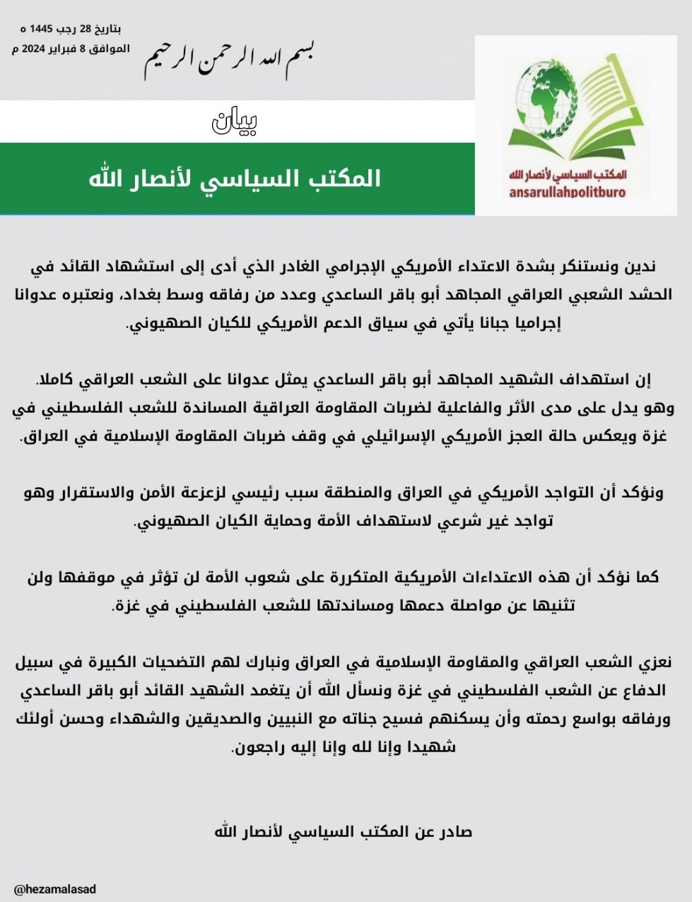 | המשרד המדיני של תנועת ההתנגדות אנסארולה בתימן גינה בחריפות את מות הקדושים של "אבו בקיר אל-סעדי", אחד ממפקדי קטאיב חיזבאללה בעיראק, במתקפת הטרור האמריקאית ביום חמישי בבוקר. |