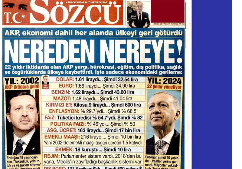 ב-2002 וב- בשנה שבה ארדואן הפך לראש הממשלה, כל קילו בשר אדום בטורקיה היה רק 9 לירות, ועכשיו הוא עלה על 600 לירות! חוץ מהמיסים והריבית הבנקאית, כל כיכר לחם גדלה מהתעריף הזעום של 18 חורוש ל-10 לירות ב-22 השנים הללו והתייקרה ביותר מפי 52.
