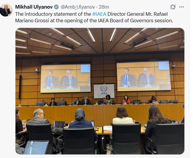 לפי סוכנות הידיעות מחר, מיכאיל אוליאנוב, נציג רוסיה הקבוע בארגונים בינלאומיים שבוינה, פרסם תמונה בה הודיע על תחילת ישיבת המועצה המפקחת של סוכנות האנרגיה האטומית הבינלאומית עם דוח ראשוני של רפאל גרושי, הנציב הכללי של הסוכנות.