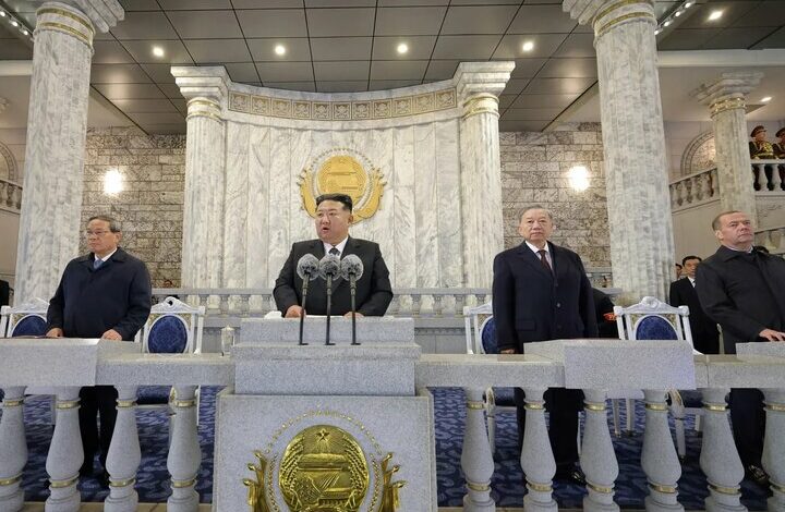 דמיטרי מדבדב, סגן מועצת הביטחון הרוסית ובעל ברית קרוב לנשיא ולדימיר פוטין, יחד עם ראש ממשלת סין לי ציאנג ו"טו לאם", המזכיר הכללי של המפלגה הקומוניסטית בווייטנאם – כולם ישבו לצד קים ג'ונג אונ במהלך המצעד הצבאי.